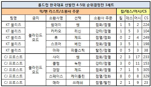 쉔 홀로 살아 돌아간 KT 불리츠는 정글 싸움에서도 패배를 거뒀고, 승리하기 어렵다는 판단을 내리며 GG를 선언했다. 22:5로 승리를 거둔 CJ 프로스트는 4위에 올랐고, KT 불리츠는 바로 내일, CJ 블레이즈와 한국대표선발전을 치르게 됐다.