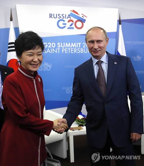 (EPA=연합뉴스) 박근혜 대통령과 블라디미르 푸틴 러시아 대통령이 6일(현지시간) 러시아 상트페테르부르크에서 열린 주요 20개국(G20) 정상회의에서 양국 회담을 시작하기 전 악수를 하고 있다.