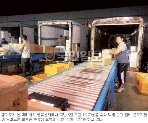 통상 오전 7시30분쯤 작업이 끝난다. 그러나 화물이 남아 있으면 일은 계속 이어진다. 모든 물량이 트럭에 실릴 때가 '작업종료' 시점이다. 이렇게 해서 받는 일당은 9만여원. 군대 시절보다 고된 하루였다는 대학생 변모(25)씨는 "힘들 거라 생각했지만 이 정도일 줄은 몰랐다"며 혀를 내둘렀다. 각 가정에 찾아가는 추석 선물은 이런 '전쟁터'를 거쳐 배달되고 있었다.