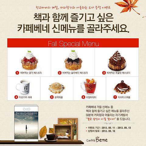 카페베네는 9월을 맞아 신메뉴 출시 기념 도서 증정 이벤트를 실시한다고 11일 밝혔다.