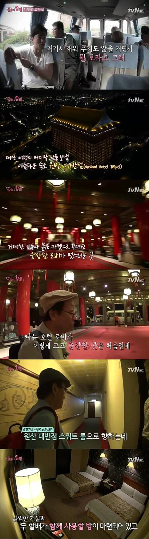 20일 오후 방송된 tvN '꽃보다 할배'에서는 대만 마지막 편으로 박근형과 백일섭이 떠난 이후, 남은 멤버들(이순재, 신구)과 이서진이 타이루거 협곡을 관광하는 모습이 그려졌다. 그리고 그 후 지친 몸으로 대만 최고의 호텔 '원산 대반점'에 묵게 된 것.