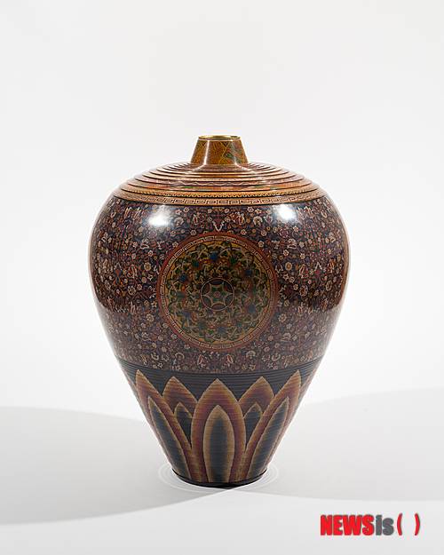 '흔적'은 전통과 현대의 문양을 재해석한 채화 건칠 화병이다. 옛것을 잃지 말고 사랑하며 현재의 행복과 건강을 기원하는 뜻으로 연화 문양을 넣었다.