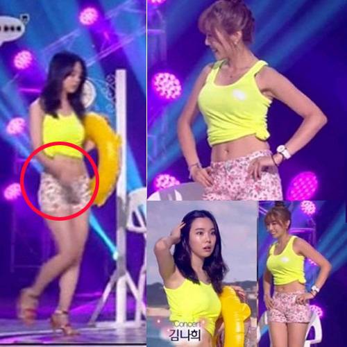 사진 속에서 김나희는 노란색 민소매 배꼽티와 꽃무늬 핫팬츠를 입고 불륨감 넘치는 몸매를 뽐내고 있다. 튜브를 든 그녀는 11자 복근을 선보이며 명품 몸매를 과시하고 있다. 개그우먼 김희원은 김나희와 똑같은 차림으로 구릿빛 피부와 탄탄한 몸매를 선보여 눈길을 사로잡는다.