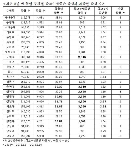 '학교수업중단률'을 봤을 때, 강남지역은 최근 2년 반 동안 8390명 학생이 학교를 그만두어, 다른 지역에 비해 월등히 높았다.