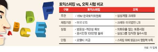 국내 대표 영어말하기 시험인 '토익스피킹'과 '오픽'이 취업 영어시험 시장에서 치열한 경쟁을 벌이고 있다. 특히 삼성그룹이 올해부터 임직원의 영어능력 평가기준을 토익 대신 오픽으로 전면 대체하면서 토익 주간사인 YBM 한국토익위원회의 발등에 불이 떨어졌다. 게다가 오픽 주간사인 삼성 계열의 크레듀가 올해 하반기부터 기존의 영어말하기 시험 외에 필기시험까지 함께 새롭게 도입하면서 그동안 별다른 대응을 하지 않던 토익 측에서도 전면전에 대비하고 있다. 일단 YBM 한국토익위원회는 기존 선두 자리를 내주지 않기 위해 시험의 신뢰도 등을 부각시키는데 노력 중이다.