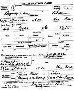 가장 눈길을 끄는 자료는 이 전 대통령이 1918년 직접 작성한 1차 대전 징집 카드다. 당시 43세이던 이 전 대통령은 이 카드에 자신의 인적 사항을 필기체로 상세하게 적었다. 출생일은 음력인 3월26일, 직업은 한국학교 교장, 주소는 하와이로 썼다. 국적은 '일본(Japan)'으로 기재했는데 이를 통해 이 전 대통령이 1919년 상해임시정부 대통령에 선출될 때까지 국적을 일본으로 사용한 것으로 추정할 수 있다. 당시 재미동포들은 징집 카드 등의 국적란에 중국, 일본 또는 조선-일본, 한국으로 다양하게 표기했었다. 이미 그때 이 전 대통령은 파리강화회의 참석을 위해 비자 발급을 요청하고 우드로 윌슨 대통령에게 국제연맹의 한국 위임통치를 청원하는 등의 활동을 하고 있었다. 이 전 대통령은 1933년 프랑스에서 뉴욕항을 통해 미국에 입국할 당시 서류에 직업을 박사ㆍ교수, 인종은 한국인, 출생지는 한국 등으로 표기했다.