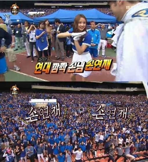 손연재는 5일 방송된 MBC TV 예능 프로그램 '무한도전'에 깜짝 출연해 재학중인 연세대를 응원했다.