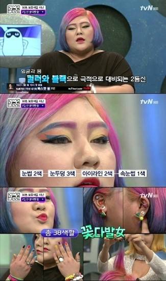 이어 박스를 벗자 화려한 색의 머리와 화장법이 눈길을 끌었다. 손톱마다 각기 다른 10가지 색깔, 귀에 5가지 이상 각종 피어싱, 머리카락도 7가지 색깔 이상이었다. 온몸이 38개의 색깔로 도배됐다.