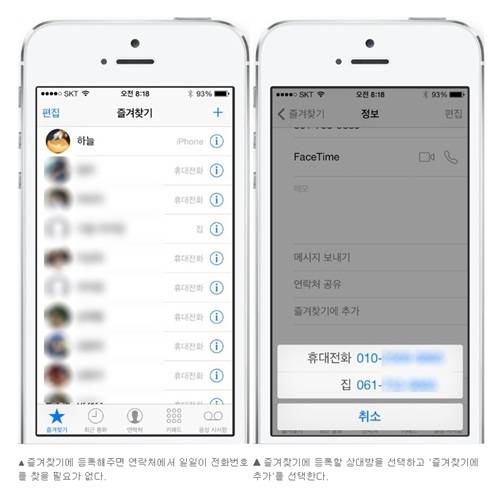 연락처에 여러 사람들의 전화번호가 등록되어 있으면 찾는 것도 일이다. 이럴 때는 친구, 가족 혹은 일적으로 통화가 잦은 거래처 직원 등 자주 연락하는 사람 위주로 '즐겨찾기'로 설정해두면 편리하다. 그러면 전화 화면 아래 메뉴 중 '즐겨찾기'에 등록되니 바로 상대방과 통화할 수 있다.