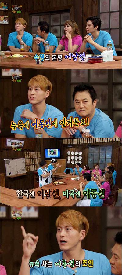 지난 10일 KBS2 해피투게더3에 출연한 류수영은 "내 본명이 어남선이다. 뉴욕에는 어동선이 있다, 사촌형"이라며 "한국엔 어남선, 미국엔 어동선이 있다"고 말해 웃음을 자아냈다.