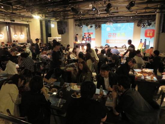 딱 배고플 점심시간에 시작된 만큼, 준비된 식사를 먹으면서 진행되었다. 유저들은 마련된 뷔페에서 음식을 먹으며 같은 테이블에 앉은 사람들과 마음을 주고 받았다. 처음 얼굴을 보는 사이도 있고, 원래 알던 사이도 있고, 알고 있긴 했지만 얼굴은 처음 본 사이인 사람 등 다양한 유저들은 어색함도 잠시, 웃고 떠드느라 분위기는 금세 시끌벅적거렸다.