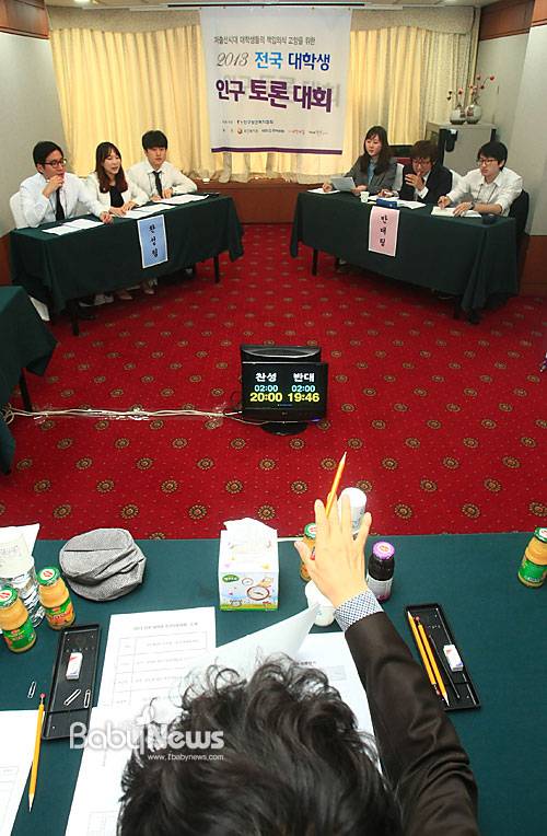 이러한 사회적 문제에 대해 곧 결혼·출산 세대에 진입할 대학생들은 어떻게 생각하고 있는지 살펴볼 수 있는 장이 열렸다. 11일 서울 송파구 방이동 올림픽파크텔에서는 96명의 대학생 32팀이 참여한 가운데 인구보건복지협회가 주최하고 보건복지부, 한국방송, 대학내일, 씽굿이 후원하는 '2013 전국 대학생 인구토론대회'가 열렸다.