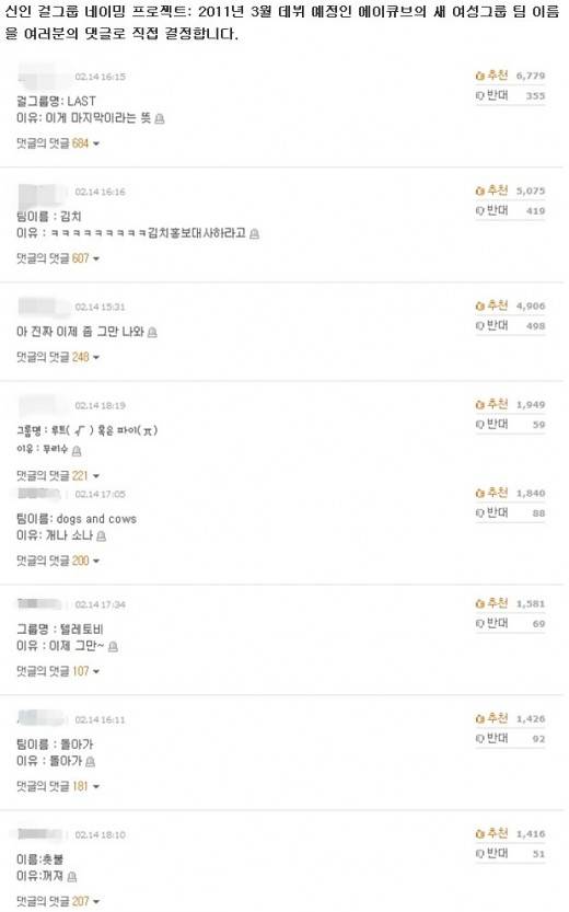 네티즌들은 "루트", "텔레토비", "돌아가", "LAST"등의 이름을 지어줬다. 공통적인 이유는 "걸그룹이 너무 많다는 것"이었다.