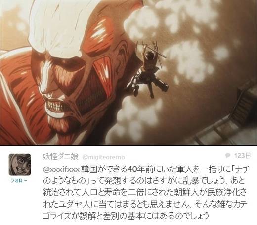 일본의 인기 만화 '진격의 거인' 작가 하지메 이사야마가 자신의 트위터 비밀계정에 "일본의 통치로 조선인 인구도 수명도 2배로 늘었다"고 주장한 사실이 지난 16일 뒤늦게 알려지면서 논란이 되고 있다.