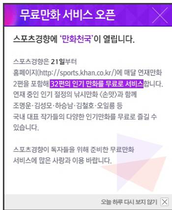 스포츠경향은 21일 홈페이지(http://sports.khan.co.kr)에 매달 연재만화 2편을 포함해 32편의 인기 만화를 무료로 서비스한다. 신문에 연재중인 낚시 만화 <손맛>, 노숙자 삶을 다룬 <노숙왕>과 함께 조명운, 김성모, 하승남, 김철호, 오일룡 등 국내 대표 작가들의 인기 만화를 무료로 즐길 수 있다. 스포츠경향은 그간 본지를 아껴주신 독자들을 위해 무료만화 서비스를 오픈하기로 결정했다.