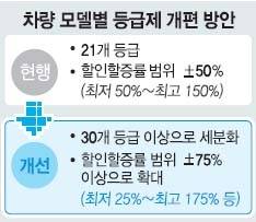 21일 금융당국 고위 관계자는 "자동차 보험의 높은 손해율로 인한 보험 업계의 부담을 낮추고 값비싼 차량에 더 많은 보험금을 물려 가입자 간 형평성을 높이기 위해 자차 차량 등급제를 현행 21개 등급에서 30개 등급 이상으로 늘려 할인할증 범위를 확대하기로 했다"고 밝혔다. 이 관계자는 "개정된 등급제는 내년 1월부터 적용되도록 한다는 방침"이라고 말했다.