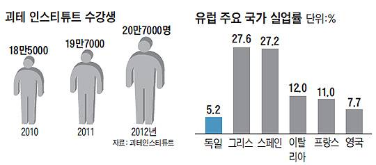 독일어 열풍이 부는 까닭은 독일을 제외한 대부분 유럽 지역의 경제가 악화하고 있기 때문이다. 이탈리아·스페인·그리스의 청년 실업률이 50%에 이르는 등 유럽 지역의 실업 문제는 심각한 상황이다. 반면 독일은 지난해 9월부터 최근(8월 현재)까지 실업률 5.2~5.4%를 유지하고 있다. 청년 실업률도 7.7%에 불과하다. 지난 8월 독일의 25세 이하 청년 실업 인구는 190만명으로 1991년 이래 최저치를 기록했다고 뉴욕타임스가 지난 4일 보도했다. 독일을 제외한 나머지 유로존(유로화 사용 17개국)의 청년 실업자는 1390만명에 이른다. 이는 유로가 도입된 1999년 이후 최고치다.