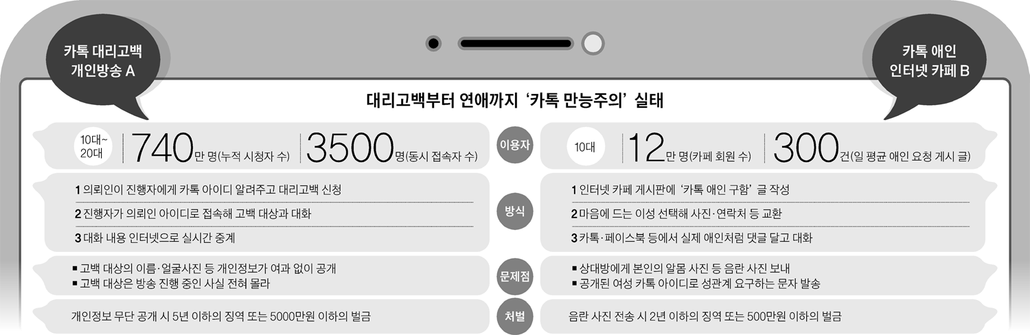 카톡을 이용한 대리고백부터 애인 대행까지…. 스마트폰 메신저가 생활화된 10~20대 사이에 카톡으로 모든 것을 해결하려는 '카톡 만능주의'가 파고들고 있다. 남녀의 직접 소통을 통해 이뤄지는 사랑의 영역까지 스마트폰 메신저로 해결하려는 젊은층이 늘고 있다.