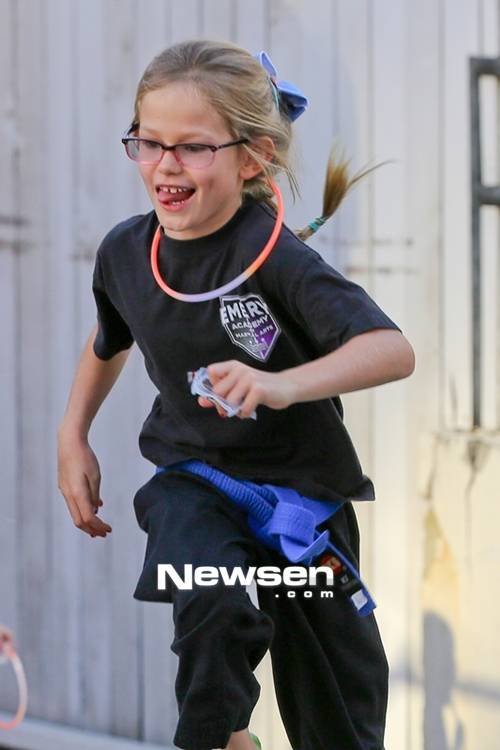첫번째 사진에서 제니퍼 가너는 가라테 옷을 입은 둘째 딸 세라피나 앞에서 걷고 있다. 두 번째 사진에서는 제니퍼 가너 첫째 딸 바이올렛이 혀를 쏙 내민 채 달리고 있다.