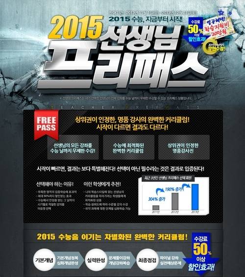 '2015 선생님 프리패스'는 수험생이 사이트 내 선생님을 선택하면 해당 강사의 강의를 내년 수능까지 무제한 수강할 수 있는 상품이다. 상위권이 인정한 우수한 강사진으로 구성되어 있어 부족한 영역을 양질의 강의로 집중 학습할 수 있는 기회이다.