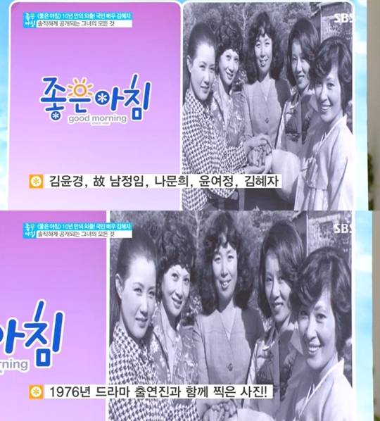 사진에는 김혜자의 젊은 모습과 나문희, 윤여정, 김윤경, 故 남정임의 모습이 함께 담겨 있었다. '전원일기'에 마을회장 부인 역으로도 출연 중이었다던 당시 모습은 환한 웃음과 미모가 돋보였다.