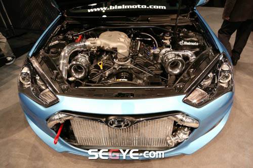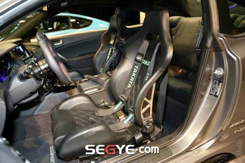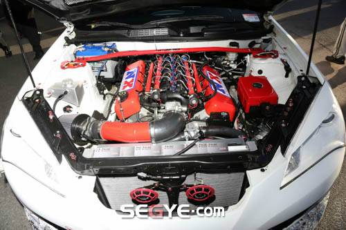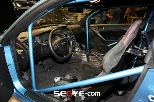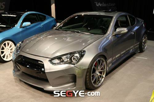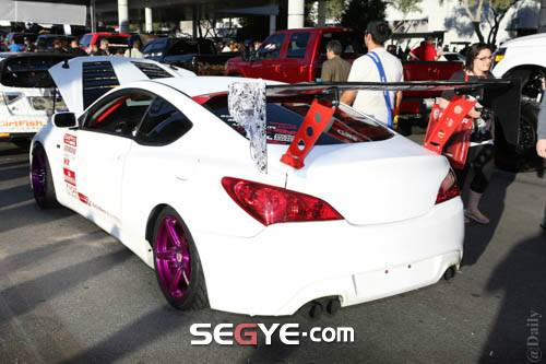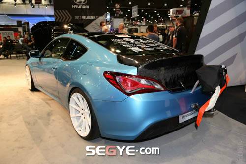 겉으로 봐서는 튜닝 내용을 알 수 없는 제네시스 쿠페도 세마쇼 행사장 곳곳에서 눈에 띄었다. 행사장 바깥 주차장 공간에 마련된 야외 전시장에는 흰색 차체에 보라색 휠을 장착하고 커다란 리어스포일러를 더한 제네시스 쿠페가 눈길을 끌었다. 당장에라도 서킷으로 달려들어갈 기세다. 튜닝을 자랑하기 위해 보닛을 열어놓았는데 엔진룸 곳곳을 빨간색으로 튜닝해 강렬한 인상을 남겼다. 바퀴는 바바리아의 휠과 함께 브램보 브레이크를 장착했고 보닛은 엔진 열기를 빼내기 위해 상어 아가미 형태로 개조했다. 실내는 더욱 화려하다 스파르코 버킷 시트를 장착하고 드리프트를 위해 사이드 브레이크 레버를 길게 올렸다. 달리다가 언제든 당기면 바퀴를 미끄러트리며 돌아갈 수 있다.