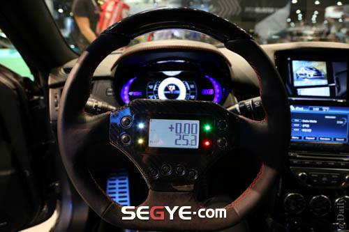 현대 제네시스를 튜닝해 온 아크 퍼포먼스는 이번에도 놀라운 제네시스 쿠페를 선보였다. 현대차 부스에 전시한 이 차는 외형상으로는 평범해 보이지만 내부를 들여다보면 전혀 다른 차의 모습을 발견하게 된다. '레가토'라는 이름을 붙인 이 차는 프리미엄 쿠페를 만들기 위한 컨셉트카다. 실내에 들어서면 가장 특징적인 것은 스티어링 휠에 붙어있는 LCD 계기반이다. 랩타임과 주행속도, 최고 엔진회전속도 등을 기록하는 화면을 통해 최고의 달리기 성능을 발휘하도록 개조했다.