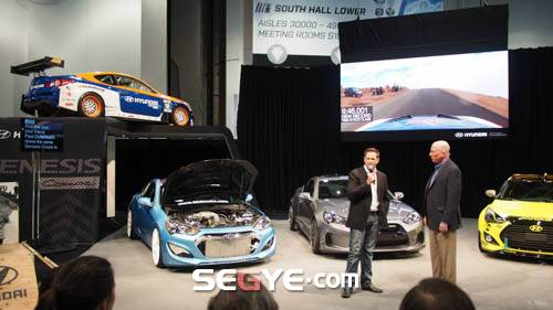 현대차는 자체 부스에 1000마력으로 튜닝한 제네시스 쿠페 등 흥미진진한 튜닝카를 선보였다. 튜닝 전문업체 비즈모토 엔지니어링은 제네시스 쿠페를 무려 최고출력 1000마력의 괴물로 만들었다. 어지간한 3.8ℓ 엔진이 300마력 전후인 것을 감안하면 이 차는 출력을 3배로 껑충 높였다. 출력이 올라간 만큼 관련부품도 박자를 맞춰 손봤다. 커넥팅 로드와 흡기 가스켓, 인젝터, 캠 샤프트 등 강성을 고려한 부품을 추가했다. 그리고 엔진 후드와 트렁크를 탄소 섬유로 제작해 경량화를 이뤘다. 엄청난 튜닝을 한 1000마력의 제네시스가 어떻게 달릴지는 아직 미지수지만 비즈모토는 "레이싱카의 폭발적 성능과 함께 공도 주행용 자동차의 안정성까지 갖췄다"고 밝혔다.