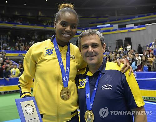 epa03953914 Brazilian player and MVP Fabiana Claudino (L) poses with Jose Roberto Guimaraes after the FIVB World Grand Champions Cup volleyball awarding ceremony at Tokyo Metropolitan Gymnasium in Tokyo, Japan, 17 November 2013. Brazil, Olympic champions and World No.1, won the FIVB World Grand Champions Cup by defeating Japan 3-0. EPA/FRANCK ROBICHON
