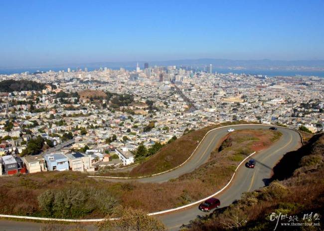 우리 차는 지금 샌프란시스코 시내를 내려다 볼 수 있는 곳으로 간다. 대로 양편에 예쁜 집들이 퍽 인상적이다. 어떤 집들은 앙증맞기도 하다. 큰 길을 빠져 나와 '트윈 픽스(Twin Peaks)라고 하는 두 봉우리의 산으로 차가 오른다. 산이라기 보다는 언덕 같다. 대형버스가 좁고 꼬불꼬불한 길을 기어올라가니 발 아래 샌프란시스코 시내 전경이 한 눈에 담긴다.
