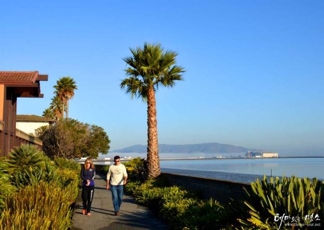 해안가 산책로. 오른쪽 낮은 담장 아래쪽은 바다이고 저 멀리 긴 선 처럼 보이는 것이 샌프란시스코공항 활주로다. |