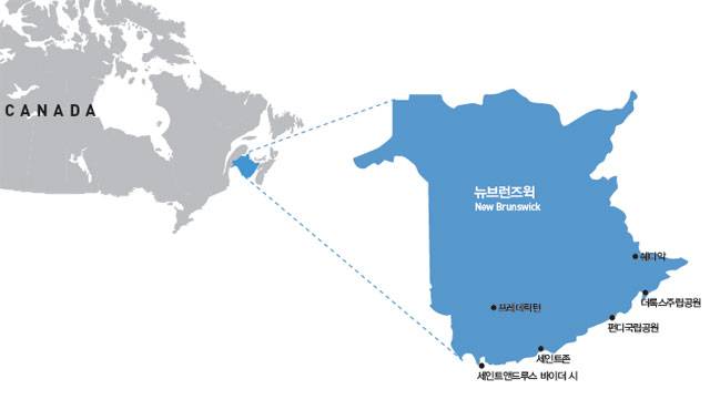 뉴브런즈윅은 프린스 에드워드 아일랜드Prince Edward Island주, 노바스코샤Nova Scotia주와 함께 캐나다 동부 해안을 구성하고 있는 지역이다. 나머지 두 지역에 비해 상대적으로 덜 알려져 있지만 그만큼 때묻지 않은 자연과 사람들을 만날 수 있다. 프랑스와 영국의 지배를 번갈아 받아 양국의 전통이 공존하고 있고 불어와 영어 모두를 공식 언어로 채택한 유일한 주이기도 하다. 남동쪽으로는 펀디만Bay of Fundy을, 북서쪽으로는 퀘벡Quebec주를 접하고 있어 해양 문화와 내륙 문화가 혼재된 독특한 매력을 느낄 수 있다.