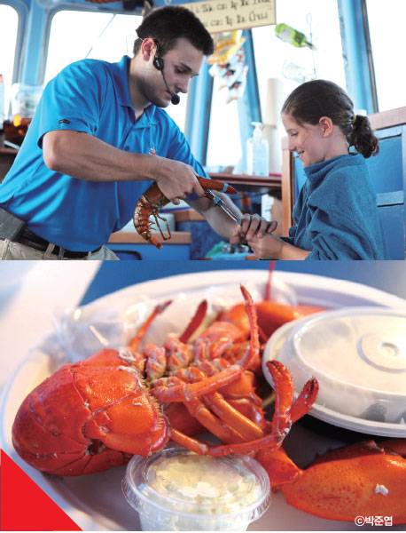 배 안에서 막 삶아낸 로브스터 시식에 앞서 가이드가 맨손으로 로브스터를 깔끔하게 해체하는 방법을 알려주었다. 도구를 사용하는 것보다 의외로 쉬웠다. 조리된 로브스터는 육즙 손실을 막기 위해 반드시 뒤집어 놓아야 한다. 뉴브런즈윅의 정통 아카디언Acadian 조리법대로 소금물에 삶아낸 로브스터는 달고 고소한 로브스터 본연의 맛을 온전히 간직하고 있었다. 로브스터 조리법의 핵심은 삶는 시간과 빠른 냉각이었다.
