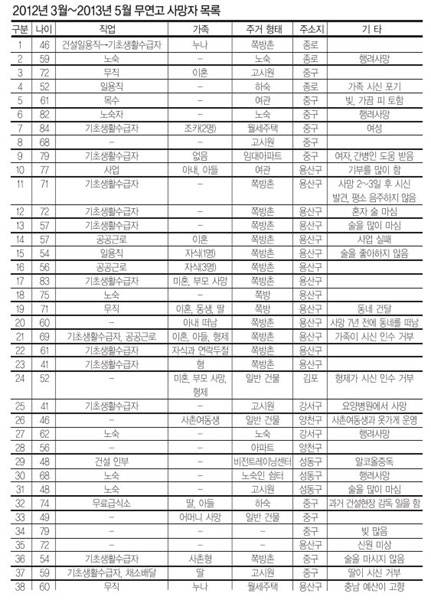 무연고 사망자 공고. 신원미상이거나 아무도 시신을 찾아가지 않은 사망자들은 이 공고에 포함돼 각 구청 홈페이지에 올라간다. 서울에서만 한 해에 280여 명의 무연사가 발생한다. 2010년 273명, 2011년 301명, 2012년 282명이었다. 공고문은 한 달 동안만 공개되는 것이 원칙이지만, 종종 삭제되지 않고 남아 있기도 한다. 우리는 2012년 3월부터 2013년 5월까지의 무연고 사망자들을 추렸다. 총 83명이었다.