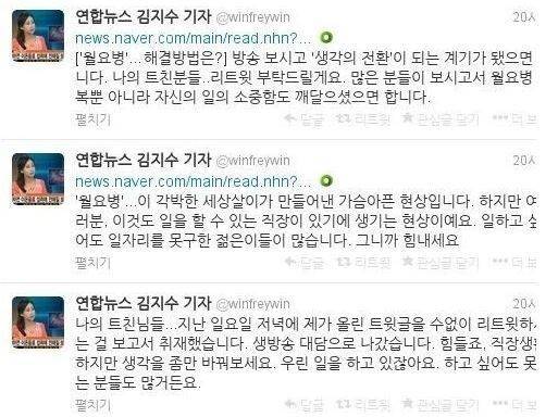 김 기자는 월요병 대처 방법 논란이 있은 뒤 자신의 트위터에 "월요병에 대한 극복은 인식의 변화가 필요하다고 봅니다. 직장이 있기에 월요병도 생기는 건데. 물론 팍팍한 우리 직장인의 삶도 고달프지만, 일할 수 있다는 건 축복입니다"라고 적었다.