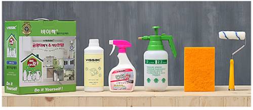 여성 혼자도 간단하게 작업할 수 있는 셀프시공세트도 출시했다. 아파트나 단독주택의 경우 곰팡이로 인해 냄새와 스트레스를 받는 주부들이 많은데 베란다 2개에 곰팡이 시공하는데 30만원 넘게 지출되고 사후 보증이 되지 않는 곳이 많아 고민하시는 분들에게는 희소식이 아닐 수 없다. 바이싹 셀프시공세트는 곰팡이제거제 팡이싹 900ml, 곰팡이방지 항균코팅제 바이싹 원액 1리터, 자동압축분무기, 페인트롤러, 수세미로 구성되어 있다. 전자기기 전용 등 개별상품 5종도 있다.