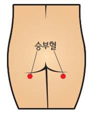 엉덩이와 다리가 만나는 곳인데 엉덩이 주름의 중앙에 위치한다