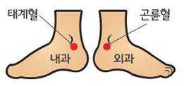 바깥쪽 복사뼈와 아킬레스 건 사이에서 움푹 패인 곳은 곤륜혈이라고 한다