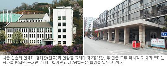 지난 1월에는 연세대 '용재관'이 철거됐다. 최인호씨 소설 '바보들의 행진' 배경으로도 유명한 용재관은 연세대 본관 오른편에 있던 근대 르네상스 양식의 6층 벽돌 건물로 57년 건립됐다. 한국 최초의 건축사 김재철 선생이 설계를 맡았고, 연세대 초대 총장인 용재 백낙준 선생의 호를 따 건물 이름을 붙였다. 2010년 11월 연세대가 공간 부족과 연구 환경 개선 등의 이유로 철거 계획을 발표하자 일부 교수와 학생들이 건물에 분향소까지 차리며 반대했지만 소용이 없었다. 용재관 부지에는 '신경영관'이 들어설 예정이다.