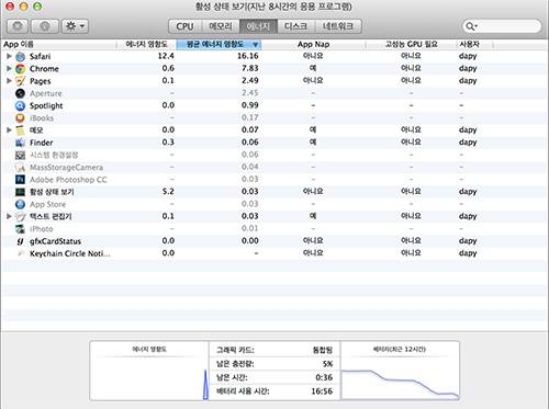 애플이 공식적으로 밝히는 맥북프로 레티나 디스플레이 15인치의 사용시간은 8시간이다. 종전 7시간에서 1시간 늘었다. 상당히 긴 배터리 타임을 가지고 있는데, 실사용에서는 얼마나 나올지 테스트해봤다. 테스트 환경을 설명하면 일단 웹브라우저가 2개와 파인더, 페이지(Pages) 등은 테스트 시작부터 끝날 때까지 계속 켜져 있었다. 웹브라우저는 각각 탭을 평균 4개 이상은 열고 있었으며, 포토샵이나 애퍼처, 아이무비 등 몇몇 애플리케이션은 간헐적으로 사용했다. 밝기는 중간이다. 이 정도는 평소 사용하는 규모와 비슷한 것으로 7시간 18분이 나왔다.