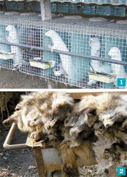 4 라쿤 한 마리가 철창에 매달린 채 밖을 바라보고 있다. 5 공장식 모피 농장의 좁은 우리 안에 밍크 한 가족이 갇혀 있다.