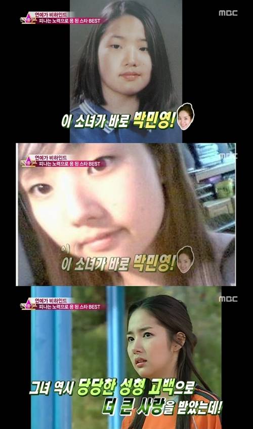 공개된 과거사진 속 박민영은 뽀얀 피부와 통통한 볼살, 앵두같은 입술 등 귀여운 외모를 뽐내고 있다. 박민영은 과거 중학교 시절 쌍커풀 수술을 받았으며 연예계 데뷔 당시 코 수술을 했다는 사실을 공개적으로 인정해 관심을 모았다. 박민영이 아름다운 외모와 날씬한 몸매를 유지하는 비결은 사과 다이어트인 것으로 알려졌다.