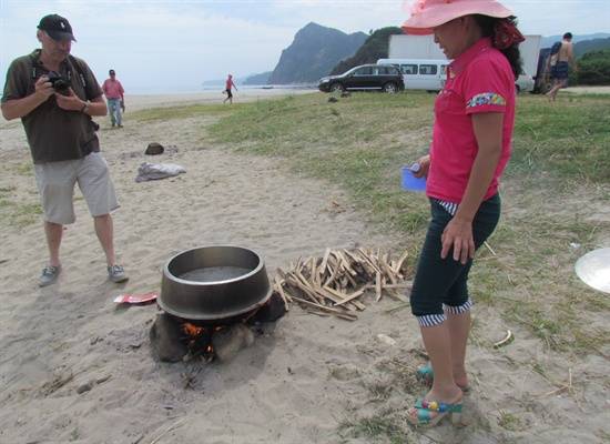 "곧 조개죽을 끓일 겁니다. 드시고 떠나십시요. 가마솥에 장작을 태워서 만드는데 정말 맛있습니다. 맵지 않으니 외국사람들도 좋아할 거예요. 함께 드시고 가시라요."