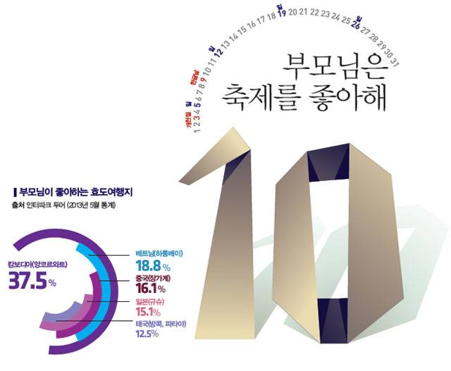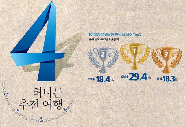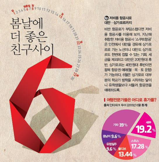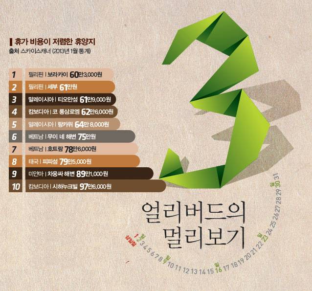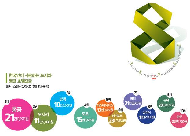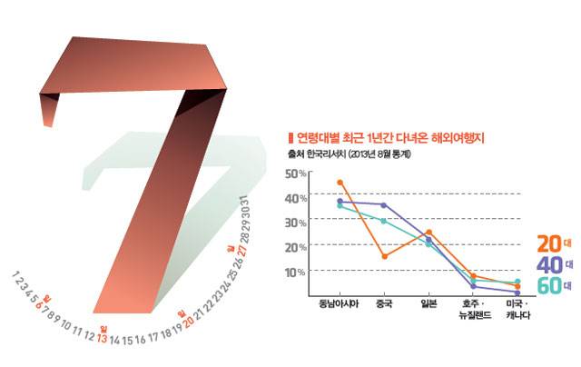 tip.징검다리 심리전 전략23년 만에 공휴일로 부활한 한글날, 올해도 '한글날 징검다리 연휴'를 기대해 볼 만하다. 금요일만 빨간색으로 만들면 4일 연휴가 되는 것은 크리스마스도 마찬가지. 징검다리 연휴 기간의 여행에는 한층 복잡한 심리전이 펼쳐진다. 모두들 처한 입장에 따라 징검다리를 건너는 방식이 제각각이어서다. 휴가를 내는 이도 있지만 순수하게 빨간 날짜만 쉬는 이들도 있다. 해외로도 많이 나가겠지만 그렇다고 국내가 한산할 리 없다. 빠름만이 해결책이다. 우선 휴가 계획을 서둘러 확정하고, 거기에 맞춰 호텔이든 콘도든 먼저 차지해야 한다.