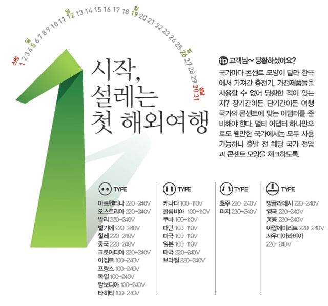 tip.고객님~ 당황하셨어요?국가마다 콘센트 모양이 달라 한국에서 가져간 충전기, 가전제품들을 사용할 수 없어 당황한 적이 있는지? 장기간이든 단기간이든 여행 국가의 콘센트에 맞는 어댑터를 준비해야 한다. 멀티 어댑터 하나만으로도 웬만한 국가에서는 모두 사용 가능하니 출발 전 해당 국가 전압과 콘센트 모양을 체크하도록.
