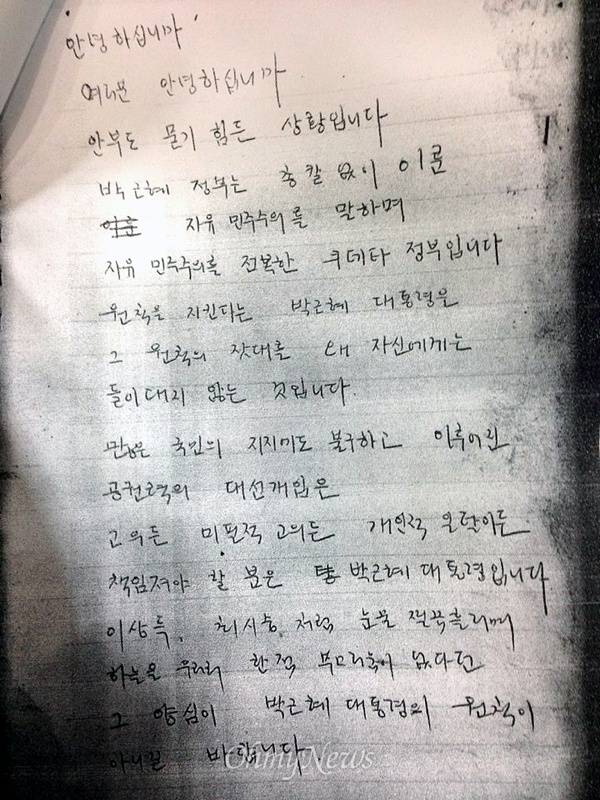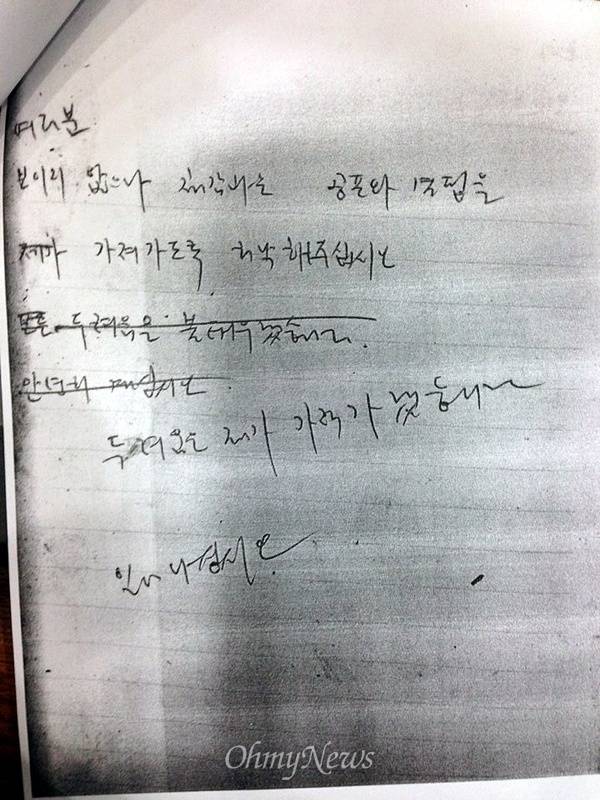 | ▲ '박근혜 퇴진' '특검 실시' 등을 요구하며 지난해 12월 31일 서울역앞 고가도로에서 분신한 뒤 1일 오전 사망한 이남종(40)씨가 작성한 유서(2장)가 2일 오후 공개됐다. |