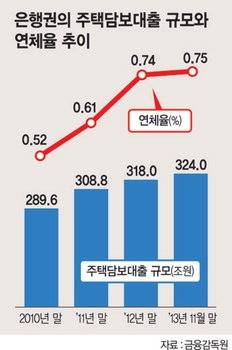 주택담보대출 연체율도 꾸준히 늘었다. 은행권의 주택담보대출 연체율은 지난 2010년 0.52%에서 2013년 11월 말 0.75%로 3년 사이에 0.23%포인트 증가했다. 저축은행의 주택담보대출 규모는 1조~2조원 수준이지만 연체율은 지난 2011년 8.2%에서 2013년 6월 말 12.6%로 4.4%포인트 높아졌다. 금융당국 관계자는 "은행권의 주택담보대출 연체율은 집단대출 부실이 큰 것일 뿐 전체 연체율은 아직 양호한 편"이라며 "다만 주택담보대출의 금리구조 개선은 시급하다. 금리인상에 대비해야 한다"고 말했다.