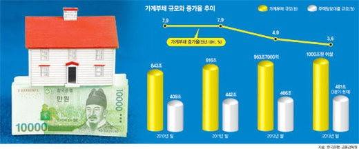 또 한국은행의 통계를 보면 가계대출 가운데 주택담보대출은 지난 2010년 말 409조원에서 2013년 3·4분기 481조원으로 15% 증가했다. 증가세의 원인은 정부의 부동산 대책이었다. 무주택자에게 집을 사도록 유도해 주택 거래량을 늘릴 의도였지만 부동산 경기는 좀처럼 움직이지 않았다. 그러는 사이 가계는 빚이 늘고 결국 지갑을 닫아 내수 경기가 꽁꽁 얼어붙은 것이다.