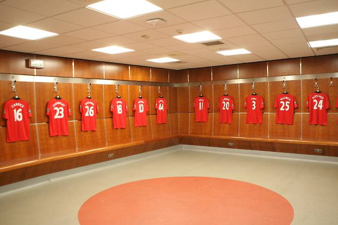 가장 인기가 많은 홈 로커룸에 들어서자 사람들 눈이 휘둥그레졌다. 고급 우드 소재의 벽면에 선수들 유니폼이 차례대로 걸려 있었다. 루니 자리는 인기 만점이었다. 맞은편 벽면엔 데이비드 모예스 감독이 작전을 지시할 때 쓰는 보드와 한국산 TV가 걸려 있다. 선수들이 하프타임 후 시원한 음료수를 마실 수 있게 소형 냉장고도 비치돼 있다.