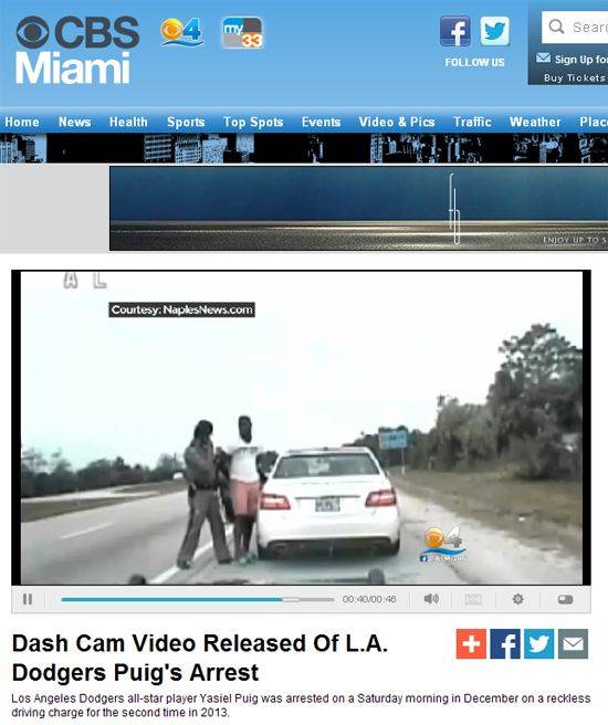 미국 CBS는 8일(한국시간) 푸이그의 체포 영상을 공개했다. 이번 영상은 플로리다주 지역 신문 '네이플스 데일리 뉴스'가 최초로 입수한 것으로 경찰차에 설치된 데쉬캠에 녹화된 영상으로 알려졌다.